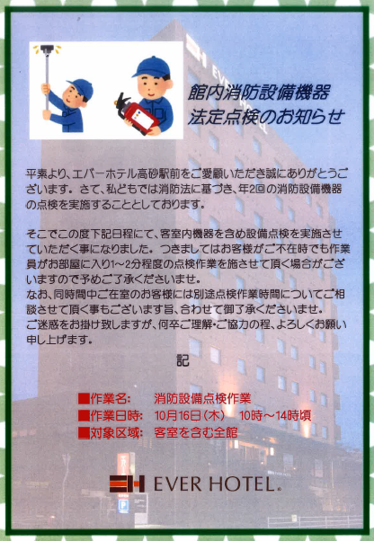 表題のとおり以下の日時で消防設備機器の点検を行います。