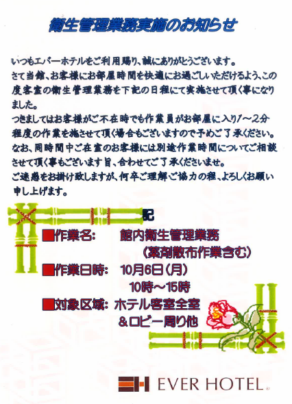 以下の日時にて客室含む館内の衛生管理業務を行います。