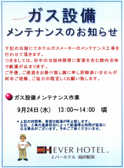 以下の日時にてガス設備のメンテナンスを実施いたします。